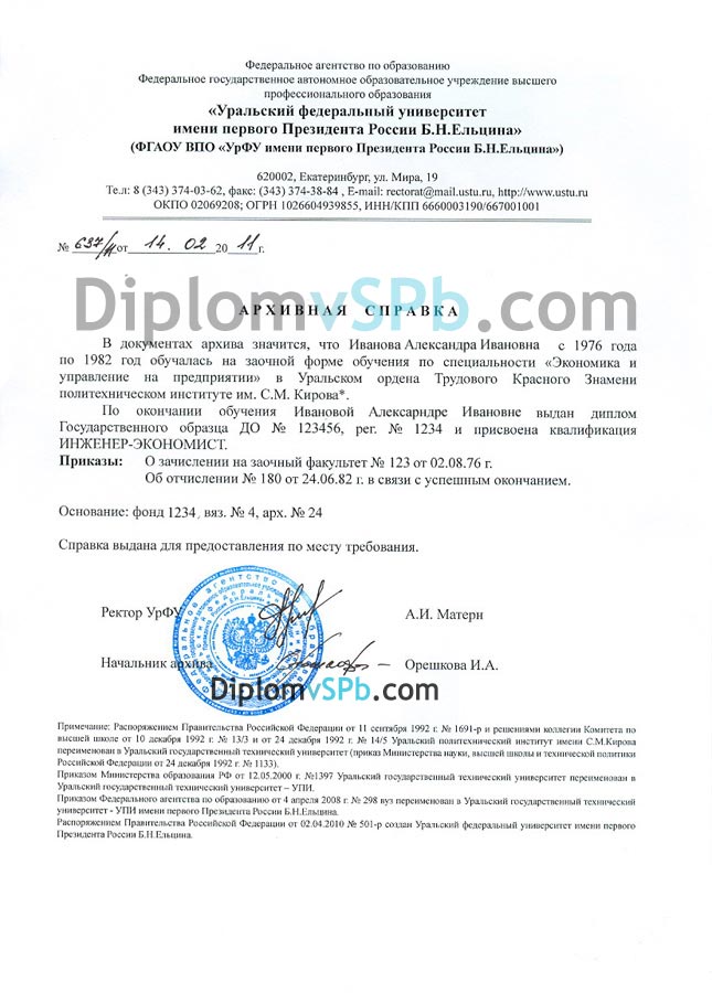 На нашем сайте Вы можете купить архивную справку, подтверждающую факт Вашего обучения в ВУЗе и получение диплома о высшем образовании. Справка будет изготовлена по образцу, актуальному для выбранного Вами института, академии или университета Санкт-Петербурга или любого другого города, заверена гербовой печатью и необходимыми подписями.